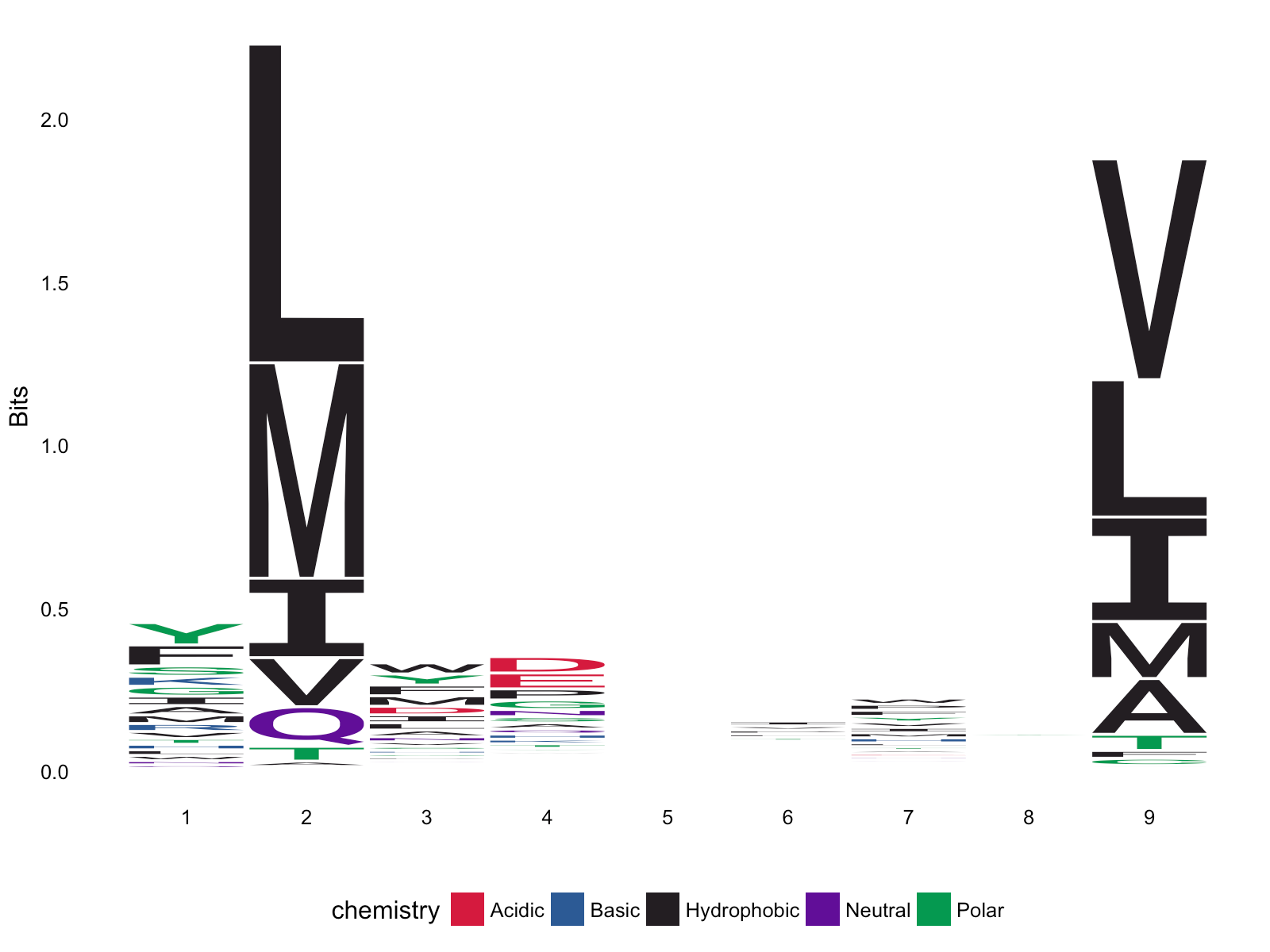 We can use the ggseqlogo package to visualize the sequence motif for the strong binders using a sequence logo. This allows us to see which positions in the peptide and which amino acids are critical for the binding to MHC (Higher letters indicate more importance):
