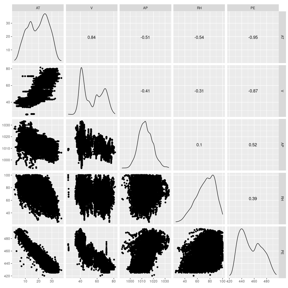 Let’s quickly inspect those five variables. Here PE is energy output, the target variable.