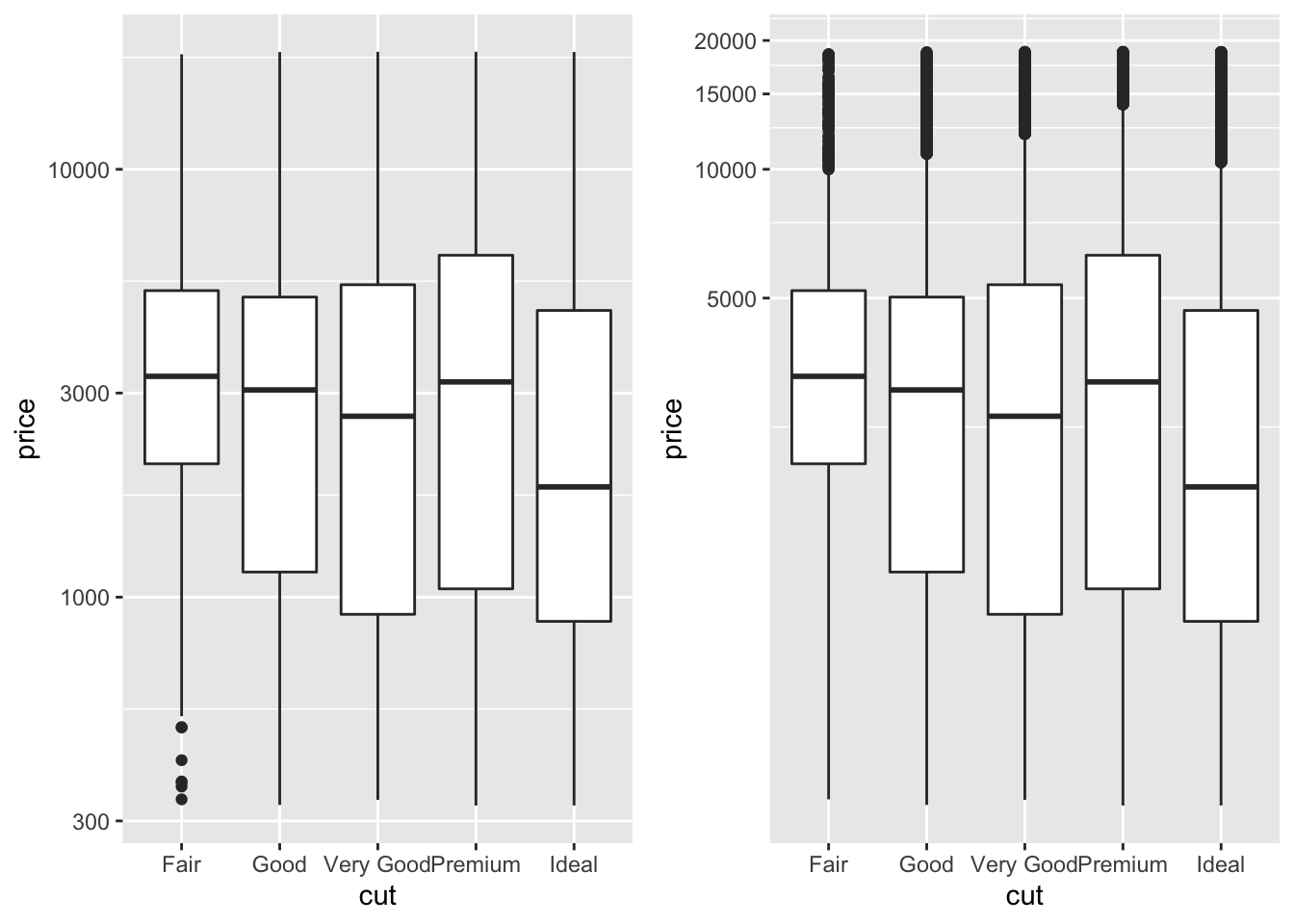 The difference between a ggplot with scale_(x|y)_log10() and a ggplot with coord_trans((x|y) = "log10") is a common reason that issues get opened in ggplot2. In short, scale_(x|y)_log10() applies log10() to the x and/or y aesthetics before anything happens, including computing any statistics. Using coord_trans((x|y) = "log10") applies log10() after everything happens. This means that a geom_boxplot() with scale_(x|y)_log10() is going to have different outliers (say) than a geom_boxplot() with coord_trans((x|y) = "log10").
