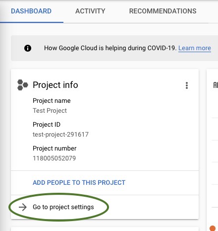 - Click on Go to project settings on the Google Cloud Dashboard project card. Usually the new project’s card will be at the top left of the page and should have the project name and number. You’ll now go to your project settings page to create a service account to access this project.