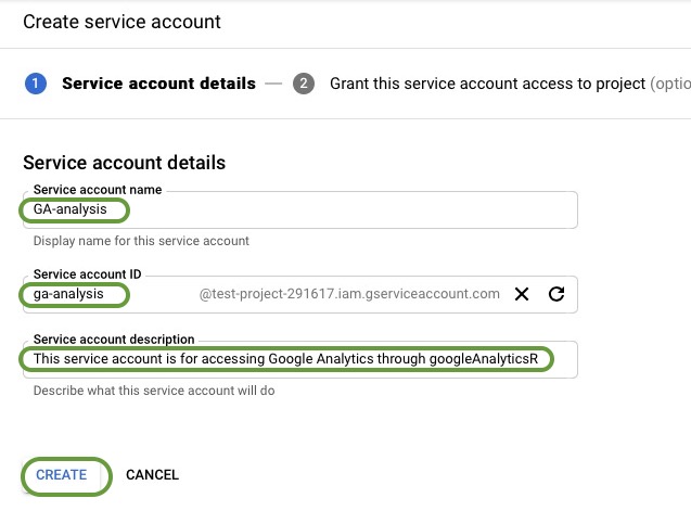 - Give your service account a name. The name will automatically populate the Service Account ID field. Record the full Service Account ID generated somewhere; we’ll need to register that account with your Google Analytics administrator. It’s also a good idea to provide a long description of what you intend to do with this account. When you’ve finished with filling in these fields, click Create.