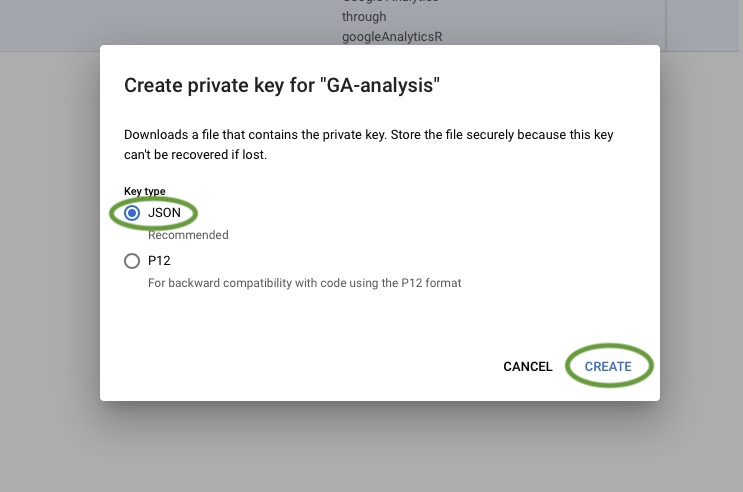 googleAnalyticsRpackage requires the key to be in JSON format. Once you’ve selected that format, click Create.