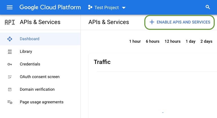 - Go to https://console.cloud.google.com/apis as shown in the screenshot below and then click on Enable APIs and Services.