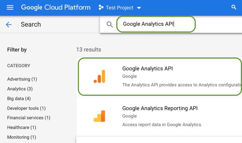 - Search for and click on the Google Analytics API.