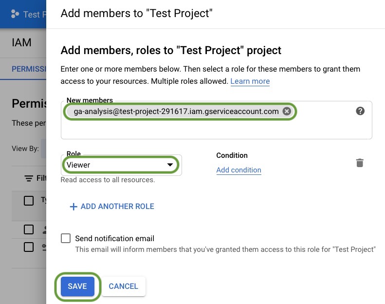 - Add your service account user to the project. Enter the email address for your service account, select Viewer as the role, and click Save as shown below.