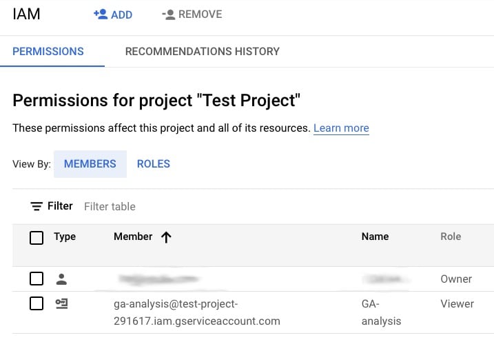 - Verify that your service account email has now been added by observing it in the list of members for this project.