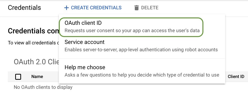 - Select OAuth client ID as the credential you wish to create.