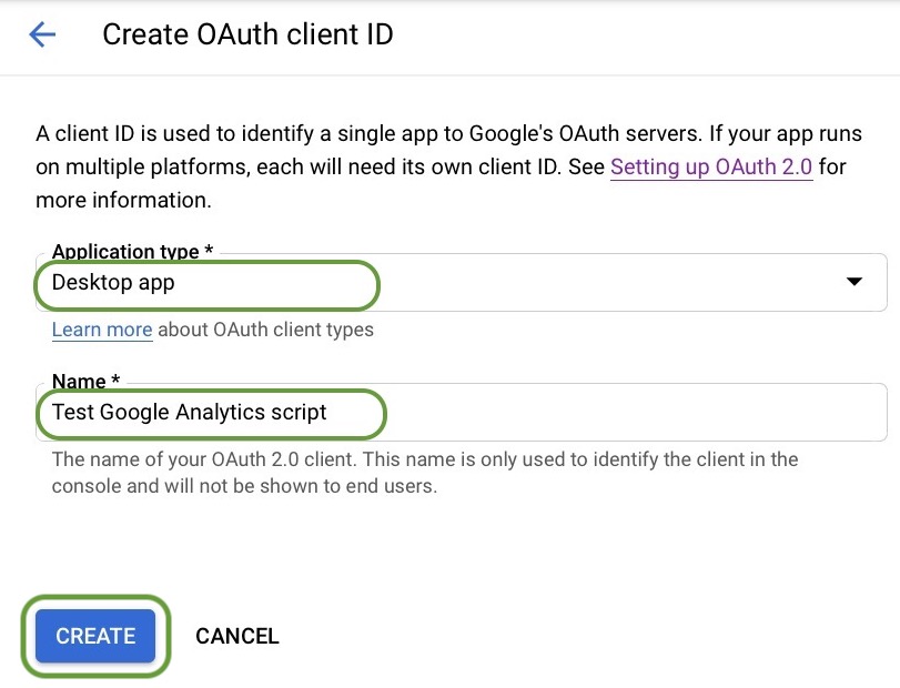 - Select Desktop app as the application type and enter your a name for your client. I chose the name “Test Google Analytics script.”