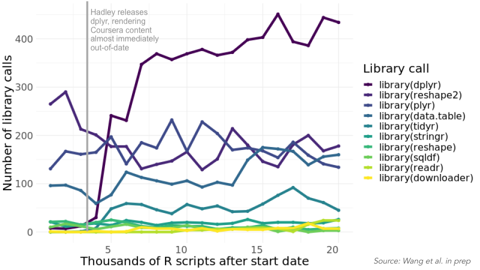 Jeff Leek tells a great story about how the Data Science Specialization team released their MOOC, only for Hadley Wickham to release dplyr right after their initial launch. This meant that a lot of the code and examples presented in the MOOC were (almost instantly) out-of-date.