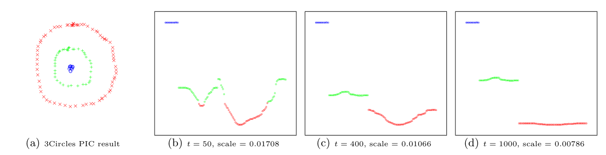 Power iteration clustering (PIC), a simple and scalable graph clustering method presented in Lin and Cohen (2010), first finds a low-dimensional embedding of a dataset, using truncated power iteration on a normalized pairwise-similarity matrix of all data points, and then uses this embedding as the “cluster indicator”, an intermediate representation of the dataset that leads to fast convergence when used as input to k-means clustering. This process is very well illustrated in figure 1 of Lin and Cohen (2010) (reproduced below)