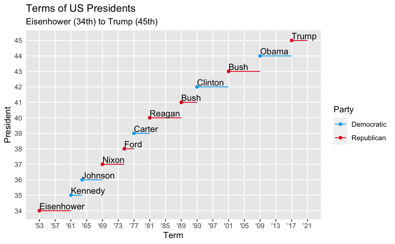The exercises in R4DS range from quick, almost obvious, drills to ones that can really make you think and spin your wheels for a bit. One such exercise for Jabir was the one on changing the display of presidential terms from Section 12.4.6 . The exercise asks: