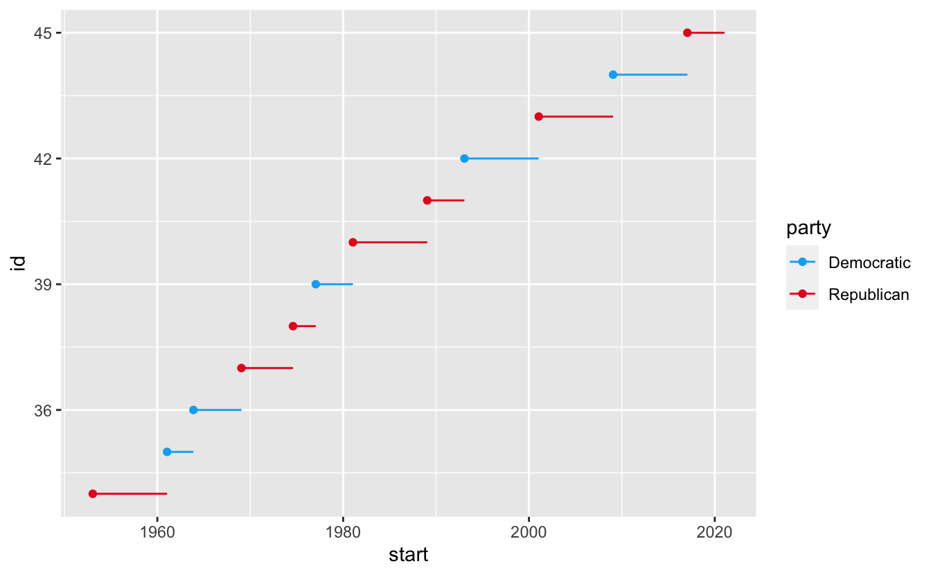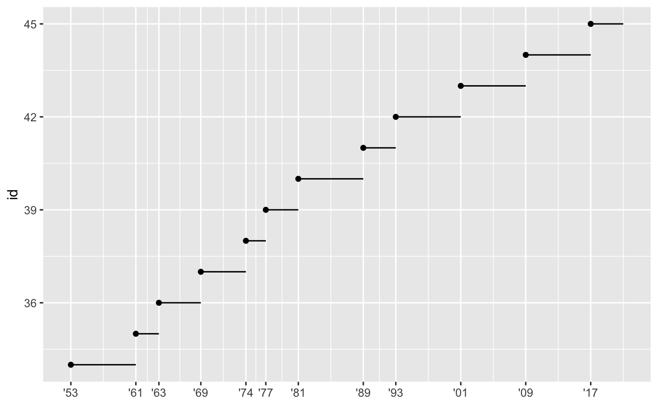 ggplot(presidential, aes(x = start, y = id)) +