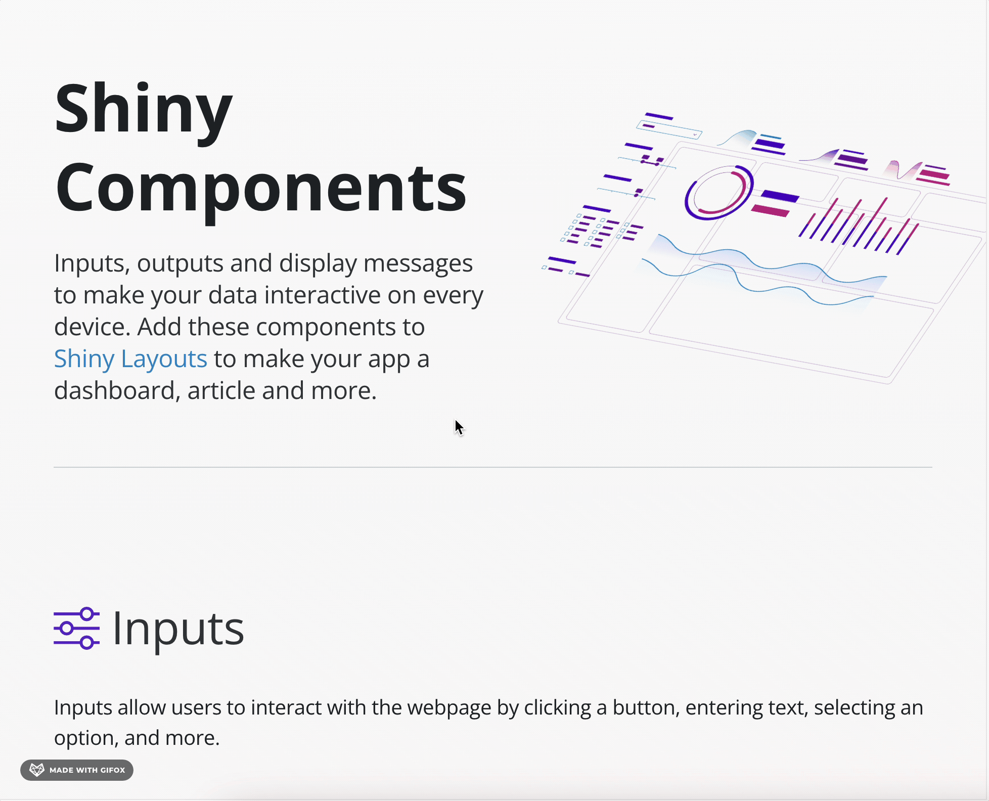 As the number of Shiny components grows, it becomes harder to find the component you want. We’ve created a Shiny Component gallery which gives you an interactive example of each component, as well as additional documentation about when and how to use it.