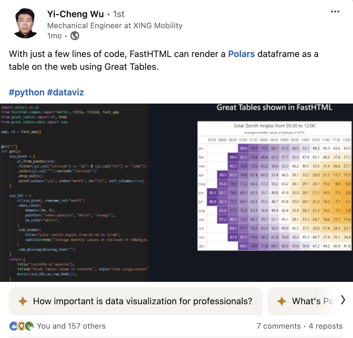 As an experiment, we added support for Polars, and wrote a post called Great Tables: The Polars DataFrame Styler of Your Dreams .