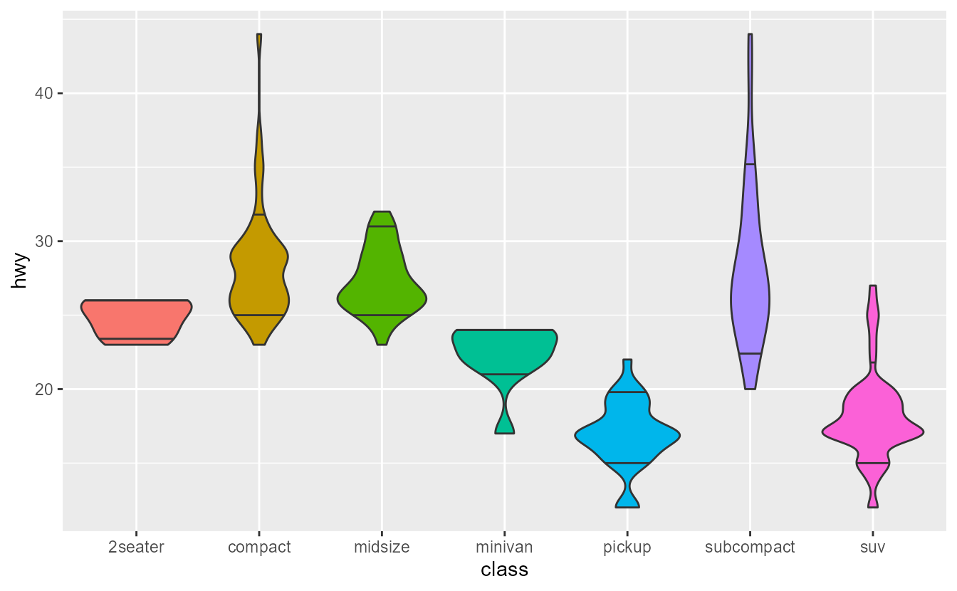 ggplot(mpg, aes(displ, hwy, shape = drv, colour = cty)) +
