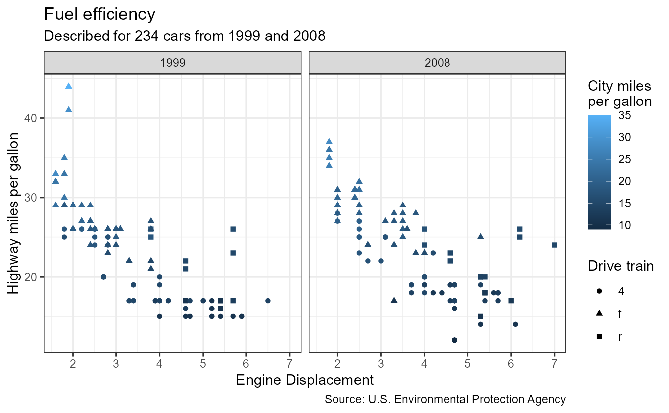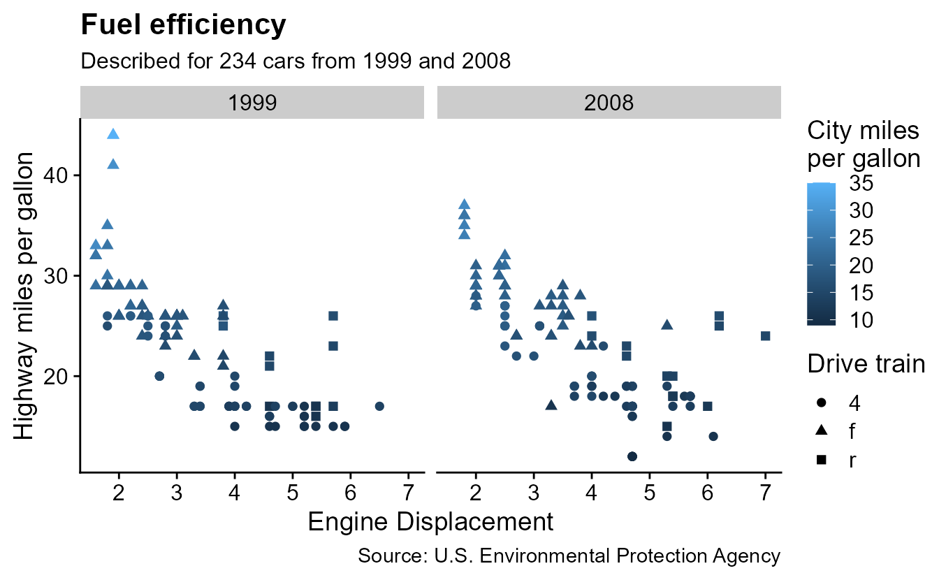 p <- ggplot(mpg, aes(displ, hwy, colour = cty, shape = drv)) +